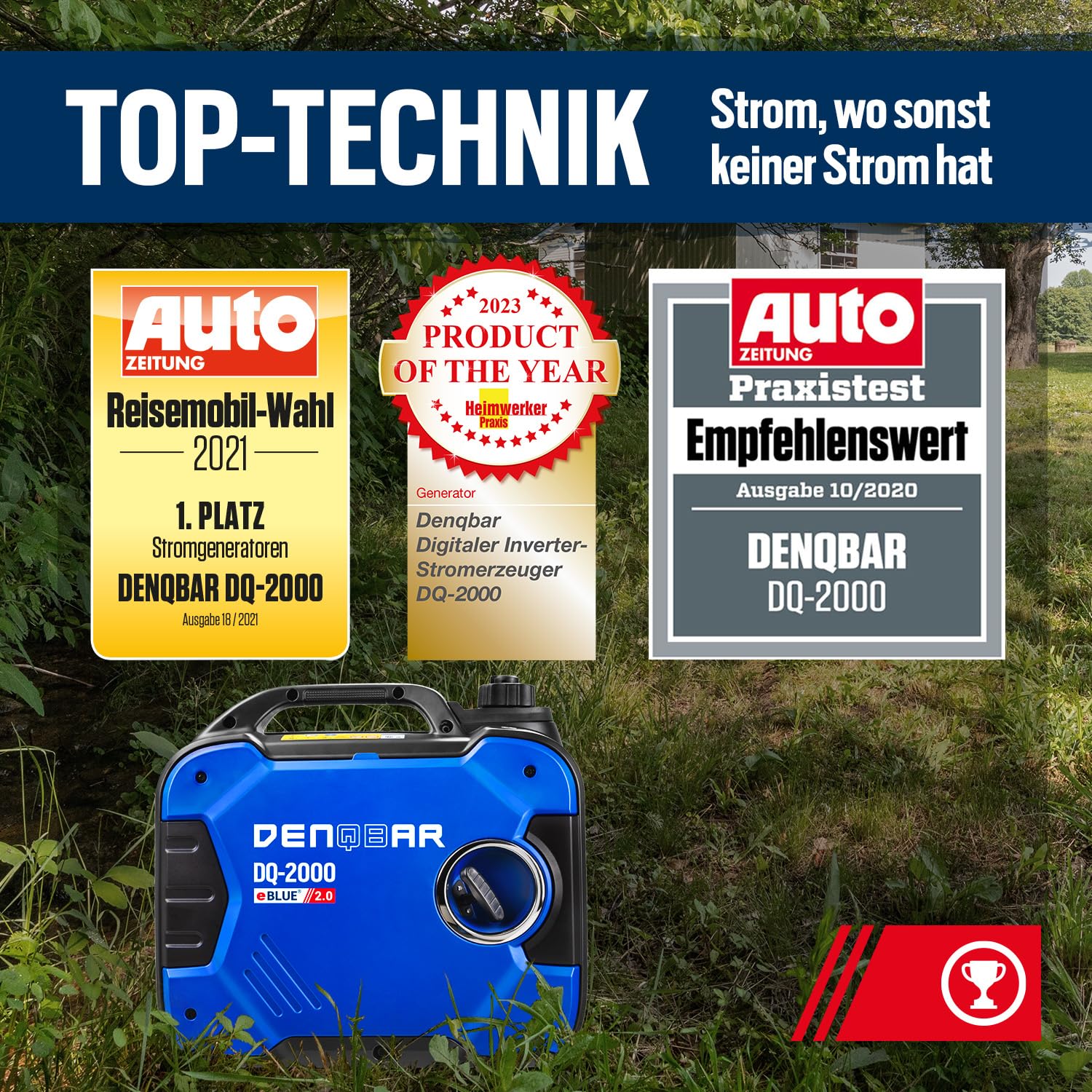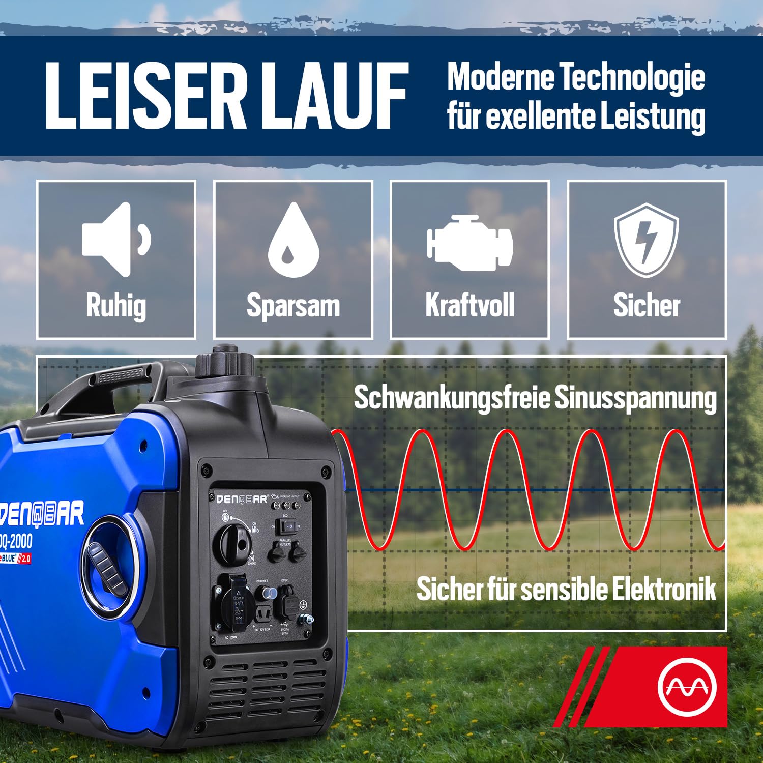 - SAUBERER STROM: Der Inverter Generator DQ-2000 sorgt durch die eBLUE 2.0-Technologie und die gekapselte Bauweise für einen superleisen Betrieb und im Öko-Modus für weniger Benzin-Verbrauch.