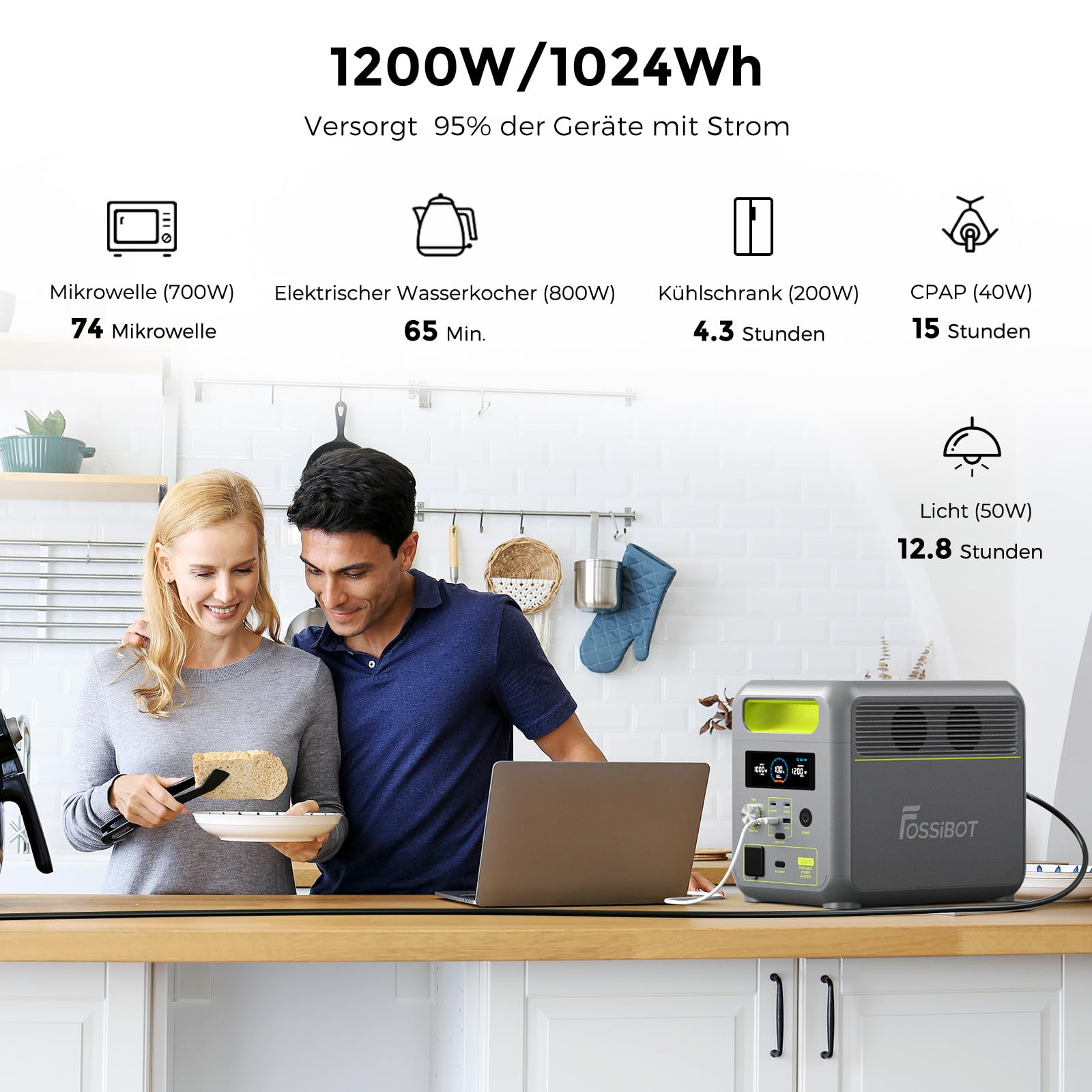 FOSSiBOT Tragbare Powerstation F1200, 1024Wh LiFePO4 Solargenerator mit 2 1200W AC (Spitze 2400W), 100W Typ-C, 0-100% Akku in 45 Min Power Station, für Camping, Wohnmobil, RV, Reisen