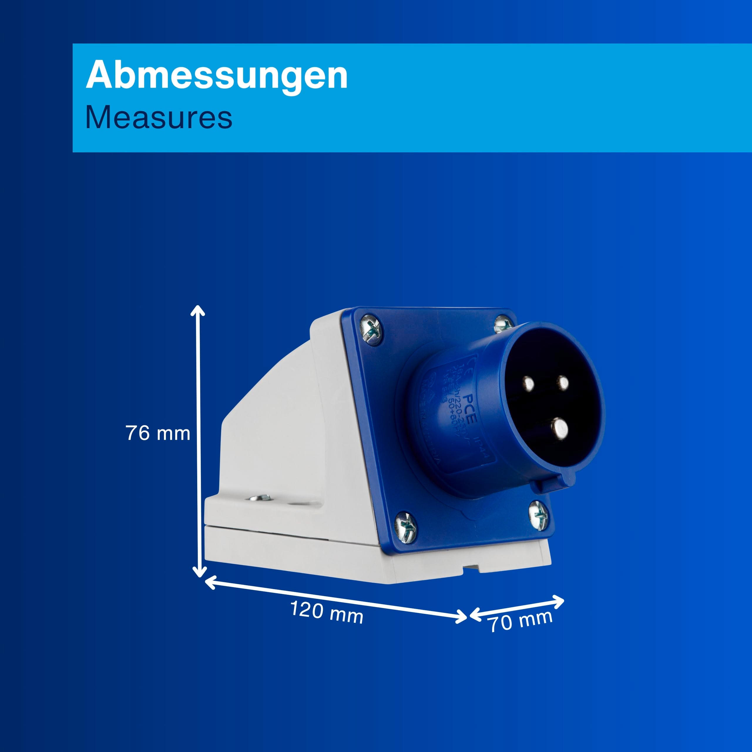 - Technische Details des CEE Steckers für Wandmontage: 230V~, 50Hz, 16A. Abmessungen (HxBxT): 76 x 70 x 120 mm, Gewicht: 174g, Farbe: blau