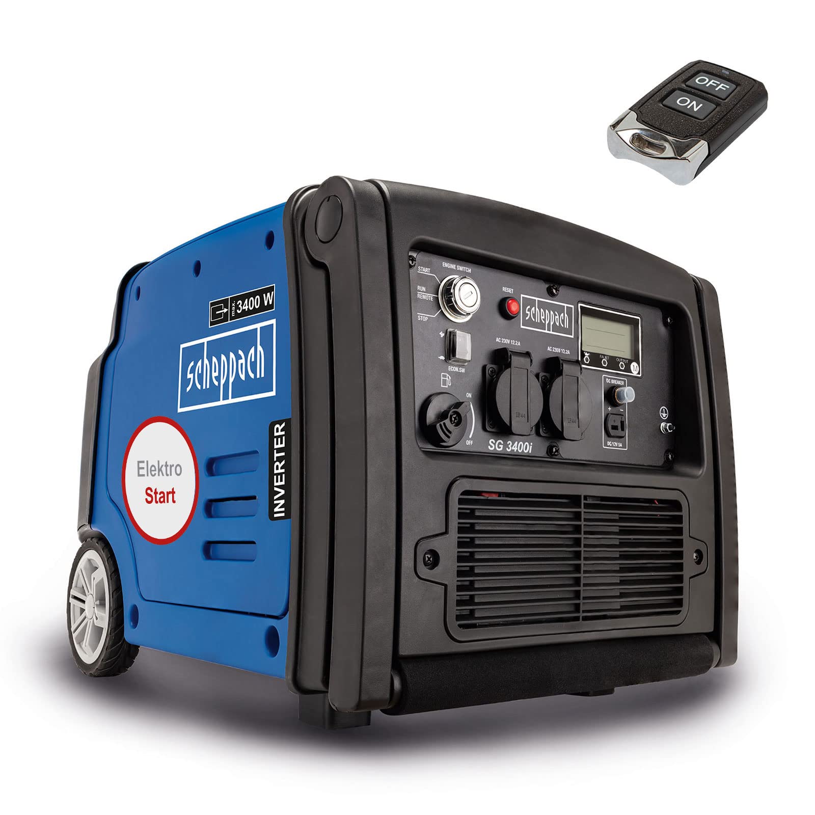 Scheppach Inverter Benzin Stromerzeuger SG3400i - 3400W | 5,1 PS | 2x 230V Steckdosen, 1x 12V | 61dB | Elektrostart mit Fernbedienung & Seilzugstart | Handgriff + Fahrvorrichtung | Stromgenerator