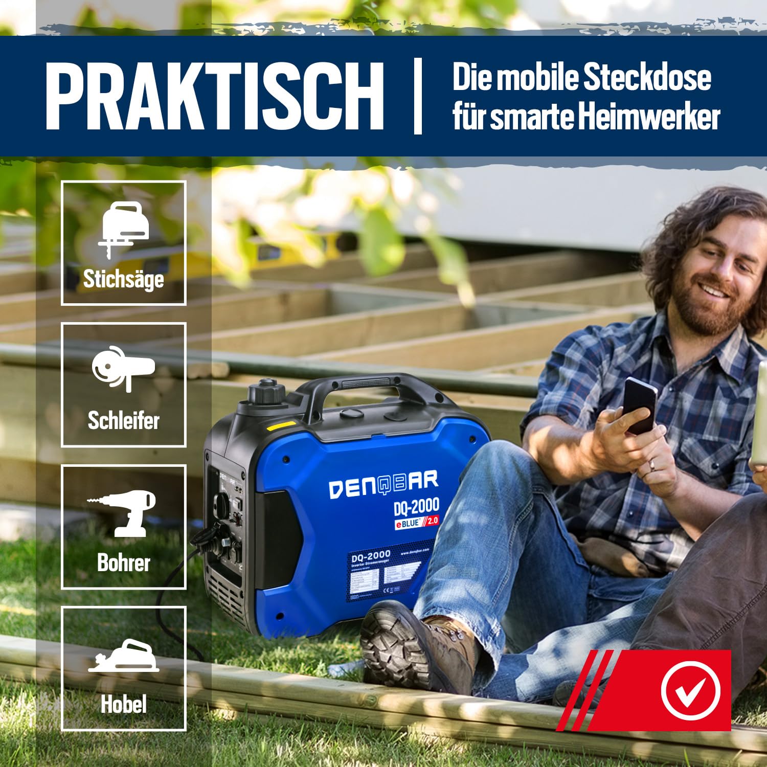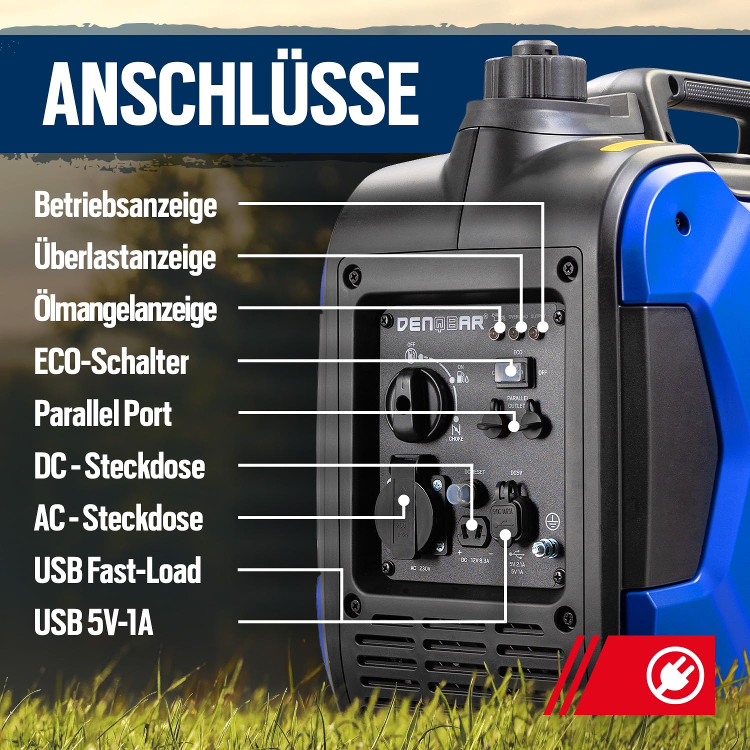 DENQBAR Inverter Stromgenerator DQ-2000 2000W Benzin Stromerzeuger mit 230V, USB Fast-Load, Superleise, 4-Takt Motor, tragbar - Für Camping, Outdoor, Baustelle, Reise, Wohnmobil und Notstromaggregat