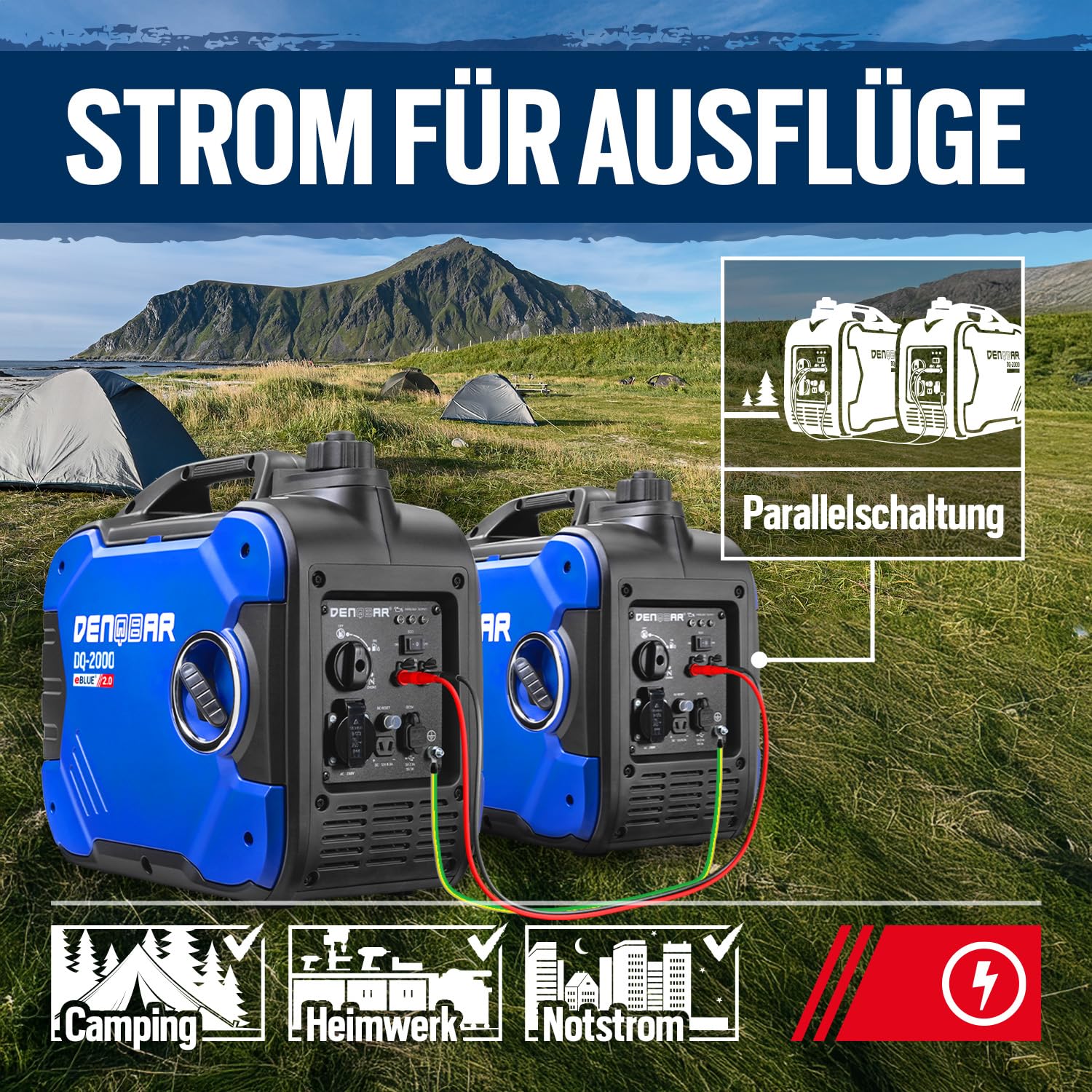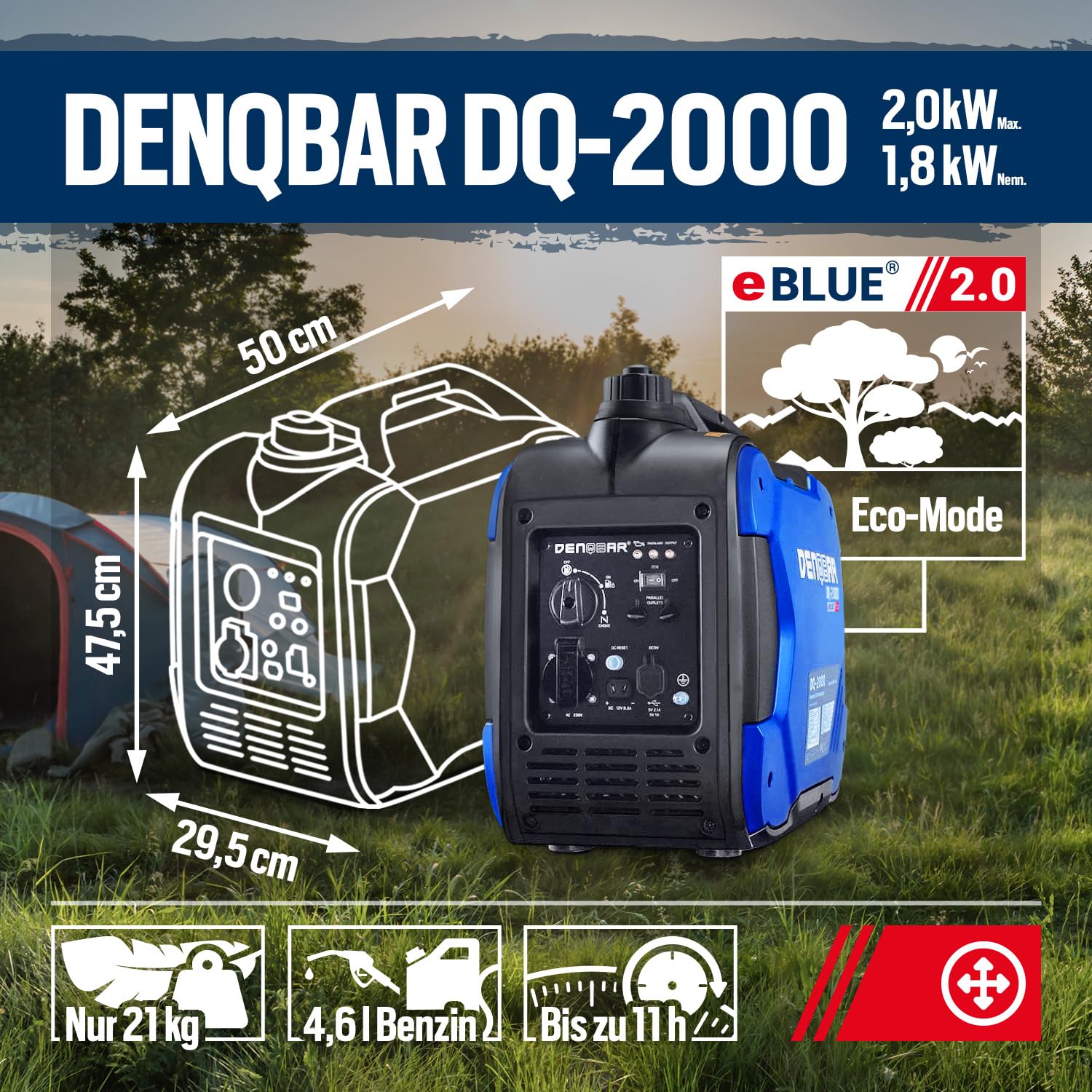 - SAUBERER STROM: Der Inverter Generator DQ-2000 sorgt durch die eBLUE 2.0-Technologie und die gekapselte Bauweise für einen superleisen Betrieb und im Öko-Modus für weniger Benzin-Verbrauch.