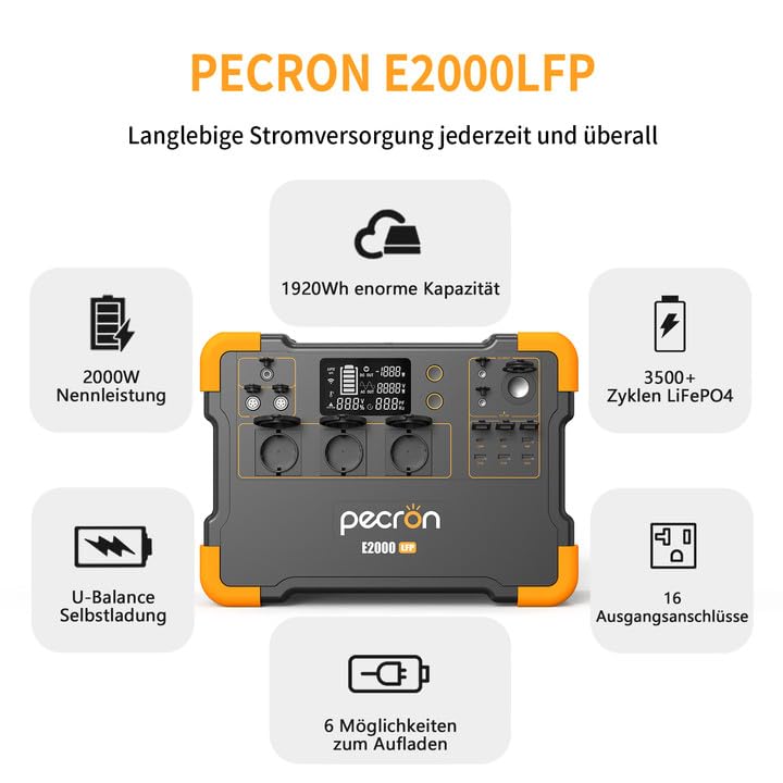 - 🧳【Kapazität erweiterbar auf 8064Wh】 E2000LFP Solargenerator bietet eine beeindruckende Kapazität von 1920Wh. Mit den separat erhältlichen PECRON EB3000 Erweiterungsakkus*2 kann die Kapazität auf beeindruckende 8064Wh erweitert werden. Eingebauter LiFePO4 Akku von hoher Qualität. Behält auch nach mehr als 3500 vollständigen Entladungen noch 80 % seiner Ladung. Damit haben Sie genügend Strom für Ihren täglichen Bedarf und den Langzeiteinsatz.