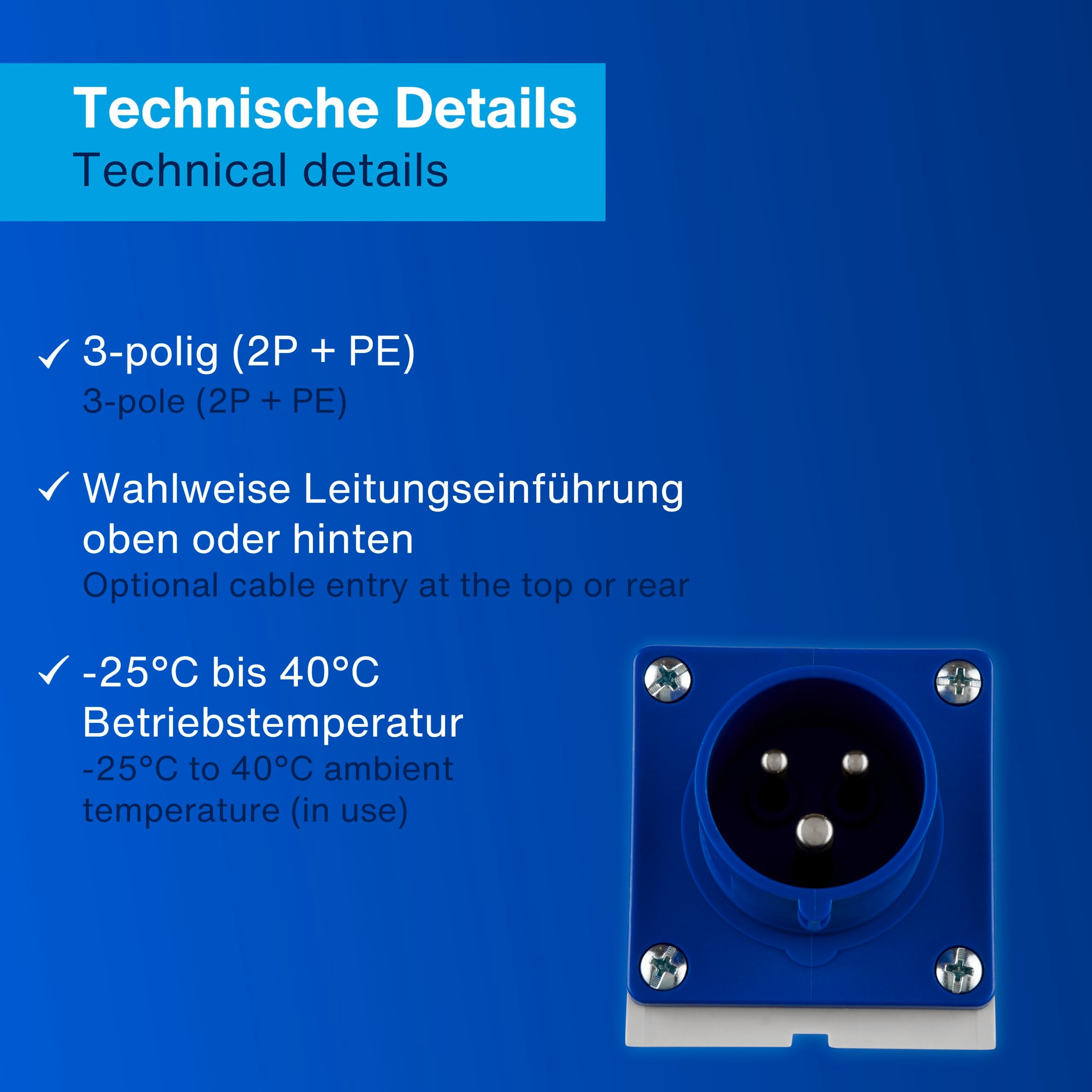 - Technische Details des CEE Steckers für Wandmontage: 230V~, 50Hz, 16A. Abmessungen (HxBxT): 76 x 70 x 120 mm, Gewicht: 174g, Farbe: blau